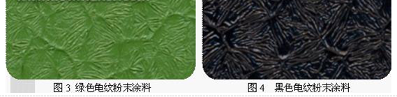 大家都見過龜殼外觀,那么龜紋即指與龜殼花紋效果類似的粉末涂料涂層的外觀效果。此類粉末涂料同樣是在不相容基礎(chǔ)上形成的龜紋效果,筆者發(fā)現(xiàn)共有幾種方法能形成:①環(huán)氧型龜紋粉末涂料,在環(huán)氧型皺紋基礎(chǔ)上添加龜紋劑形成物;②環(huán)氧/聚酯型龜紋粉末涂料,采用特殊的6/4型的混合型聚酯樹脂,以適量乙酰丙酮鋁(皺紋催化劑)作為催化劑,外添加龜紋劑形成物;③低酸值的羧基封端聚酯樹脂與消光型GMA丙烯酸樹脂采用特定比例,在外添龜紋劑的基礎(chǔ)上形成物;④低羥值的羥基封端的聚酯樹脂與四甲氧甲基甘脲(TMMGU)在WL胺封閉磺酸的催化作用下,外添加龜紋劑能形成非常穩(wěn)定的龜紋效果涂層,見圖3、圖4。其典型配方見表3。
