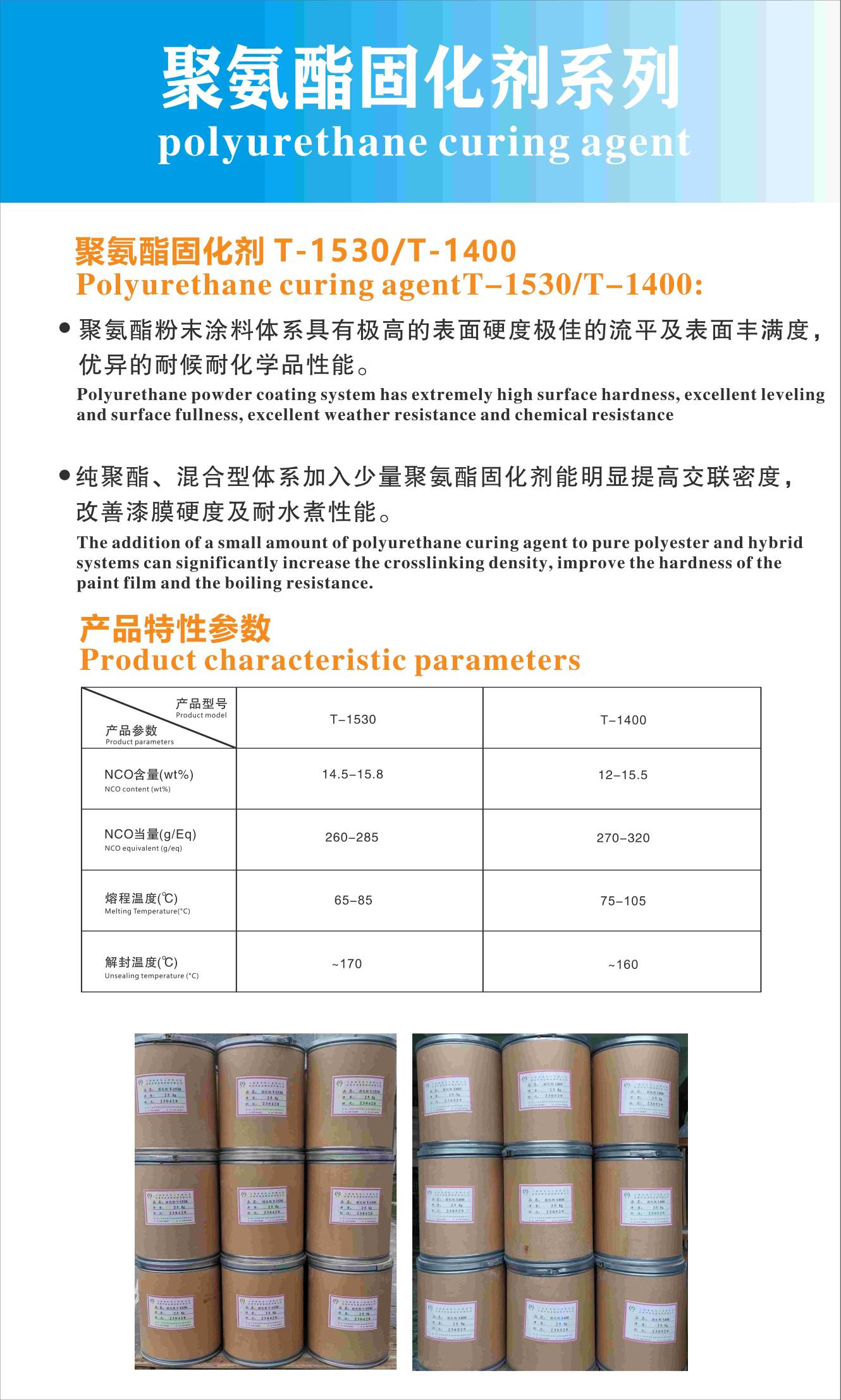 其中,索是化工的固化劑T-1530是一種用于與含羥基性樹脂酯合的多異氰酸酯加合物。可與各種含端羥基的聚酯樹脂和丙烯酸樹酯配合,用于制造具有優(yōu)異物理性能的耐候型裝飾性粉末涂料。所用的多元醇對于涂料的性能具有決定性的影響。
